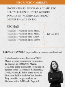 PALOMA NAVARRO es periodista y curadora audiovisual. Ha trabajado como editora en VICE Media y como productora y guionista de podcast en SONORO Media. Colabora como periodista freelance en medios como Gatopardo, Kamchatka, Coolt, Pikara, El Salto, entre otros. Es directora del Festival de Cine Bendita Tú y también programadora en distintos sitios del Estado Español.
